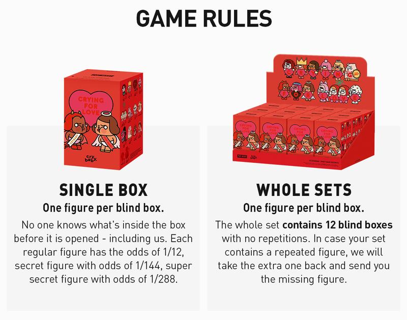“Blind box” means no one knows which exact figurine of the series you may get before opening—nor do us. A regular figurine will be replaced if the secret edition appears in the whole set (big congratulations!!!)